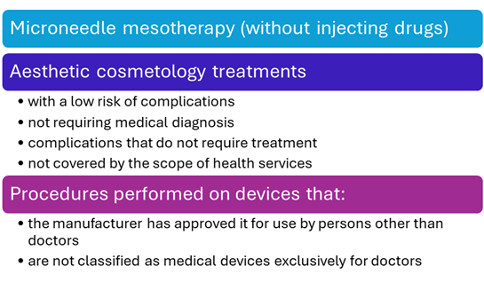 The aim of the adopted regulations is to ensure maximum patient safety by clearly separating medical procedures from aesthetic cosmetology treatments with a low risk of complications and assigning full responsibility for the entire treatment process to the physician as a person with appropriate qualifications and authorizations.